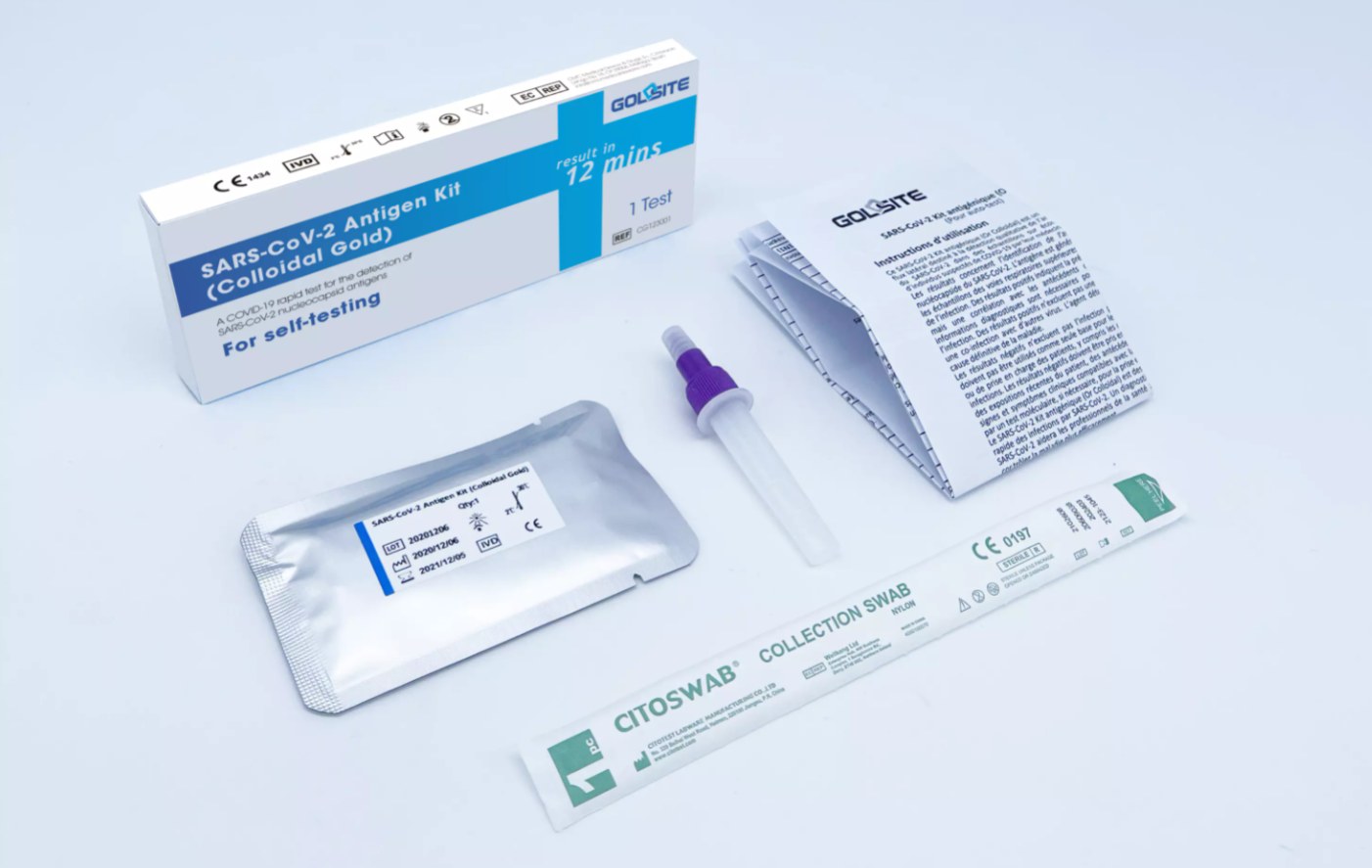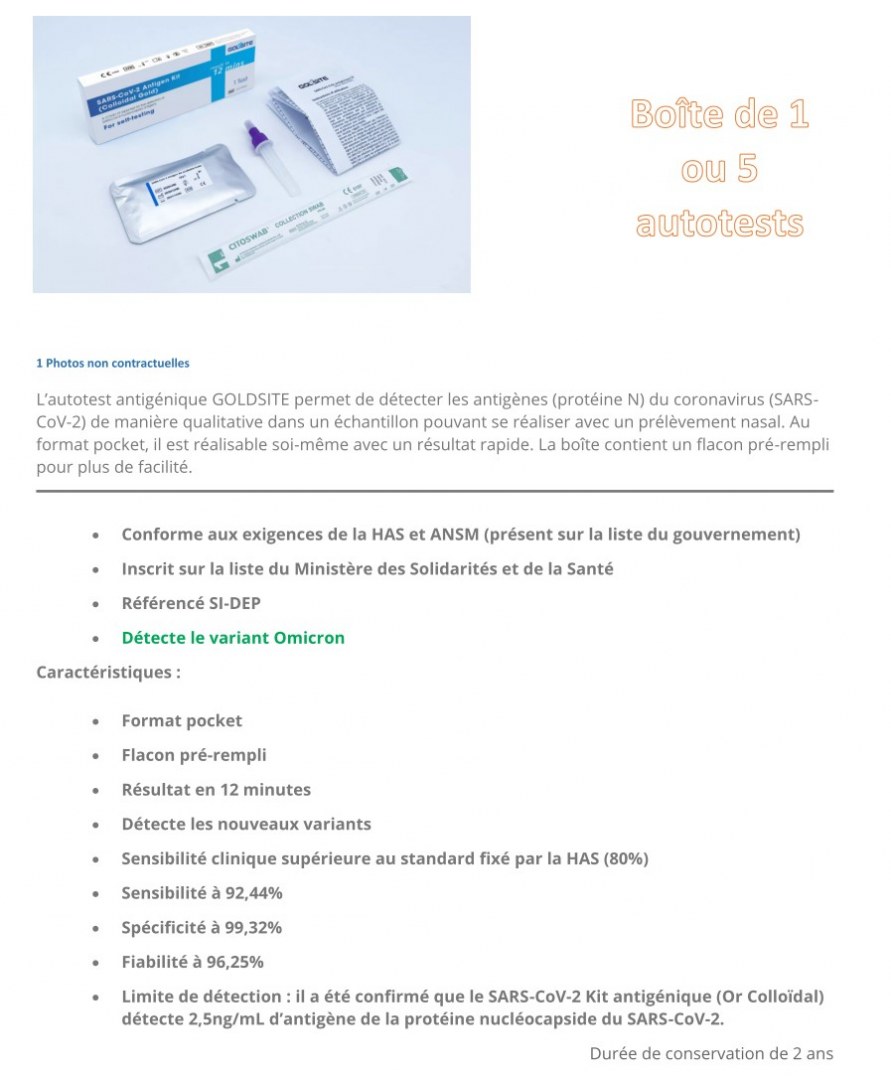 boîte de 5 autotests (CE/ANSM/HAS) avec écouvillon nasal, marque Goldsite . Produit recensé sur la pate-forme Test Covid-19 du Ministère des Solidarités et de la Santé.