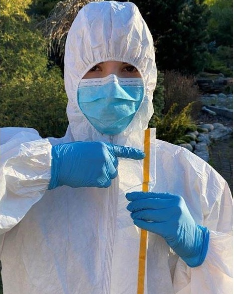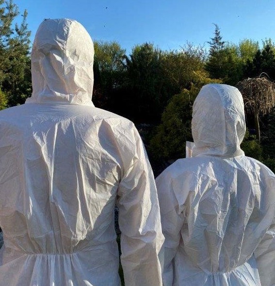 Combinaison de protection avec tresses et capuche en taille L (cat. III type 5/6). La combinaison est faite d'un matériau respirant qui réduit le risque de propagation des germes à la peau. Il a des marques dans la capuche, aux poignets et aux chevilles. La combinaison est fixée avec une fermeture à glissière express en plus sécurisée avec une couche de matériau.