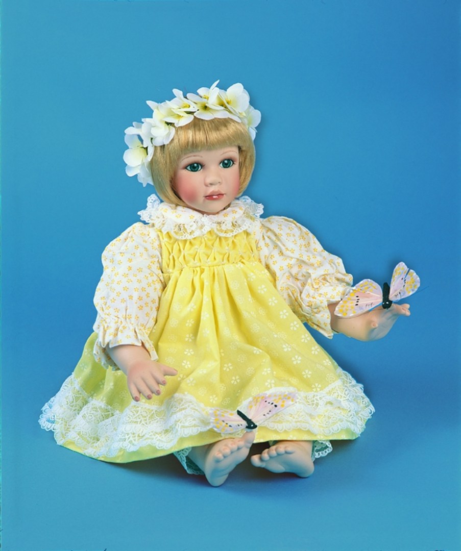 Zoé porte sous sa jolie robe couleur de soleil, un chemisier à col rond et un legging, imprimés de petites fleurs jaunes, en coton rehaussés de dentelle. Elle est livrée avec deux jolis papillons (ailes en plume peintes à la main) que vous pourrez positionner sur la main et le pied de la poupée grâce à un petit adhésif situé sous le corps des papillons.