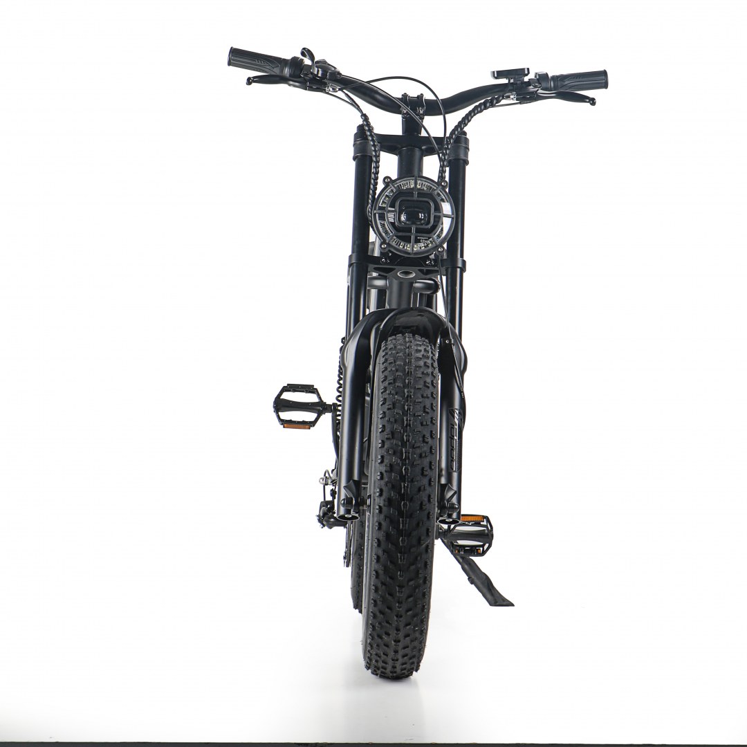Gardant toujours son look de moto vintage, le vélo électrique fat bike dispose d'un design racé par rapport aux vélos électriques classique. L'aspect baroudeur et tout-terrain est immédiatement visible à l'aide des larges roues crantées et du cadre d'une forme unique.