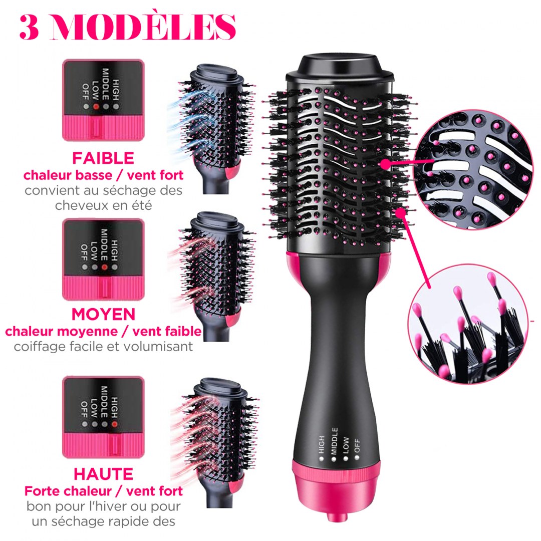 BROSSE MULTIFONCTIONNELLE : Séchez, stylez, bouclez ou lissez les cheveux qu'à l'aide d'une seule brosse. Pour lisser les cheveux, créez du volume aux racines et des extrémités joliment courbées, pas besoin d'utiliser un autre appareil. Mode chauffant pour séchage rapide, mode moyen pour styler et mode froid pour perfection de style