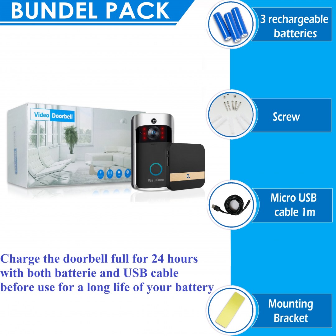 Walikann est une sicété Française spécialisée en domotique, nous vous proposons des sonettes vidéo connectées 720P sans fil avec 3 batteries rechargeables Lithium-ion 18650 + carillon.