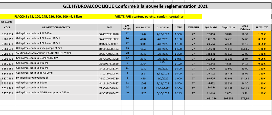 Nous vous proposons un stock d'une gamme complète de GEL HYDROALCOOLIQUE conforme à la nouvelle réglementation 2021 à des prix hyper compétitifs.