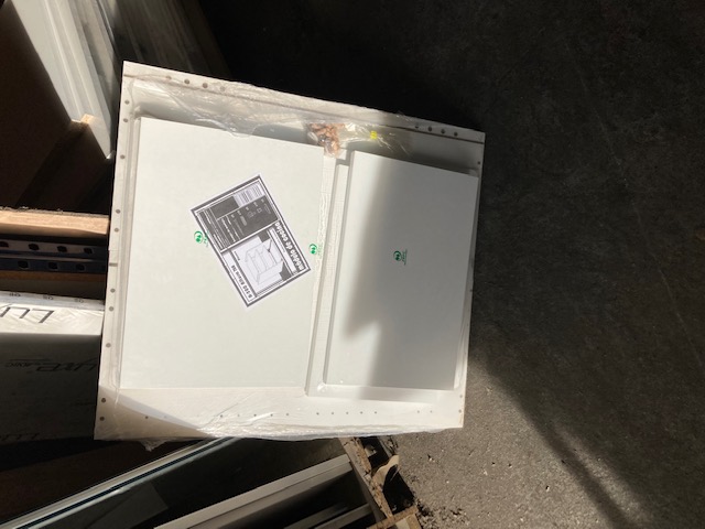 Stock de caissons pour cuisine gris et blanc. En mélaminé épaisseur 19, à coller avec tourillons.