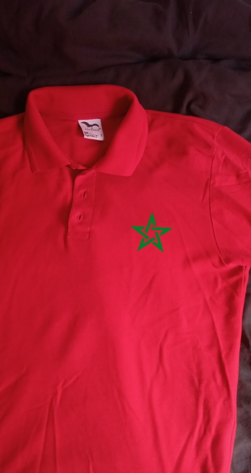 Actuellement : Polo rouge avec étoile verte du Maroc en broderie sur l'avant côté gauche.