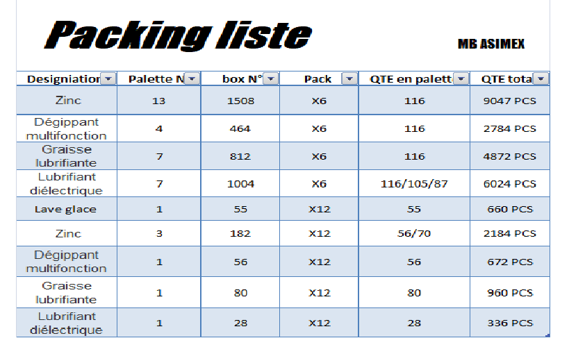 Lots de produits lubrifiants reparties en 42 palettes (pack X6) (pack X12) (27 839 PCS)