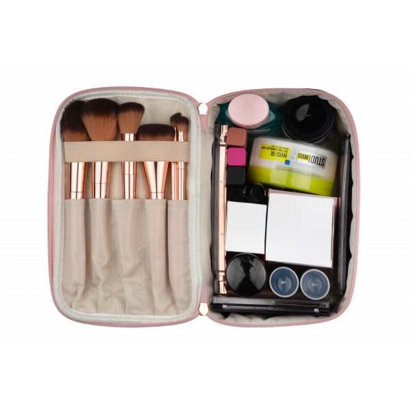 Le vanity "Rose Gold Obsession" présente un revêtement rose gold ultra tendance. Son design compact et léger en fait un compagnon idéal pour vos voyages ou pour garder vos produits organisés à la maison.L'intérieur spacieux du vanity est divisé en plusieurs compartiments et poches, offrant amplement d'espace pour ranger vos produits de maquillage, vos pinceaux, vos accessoires et bien plus encore.