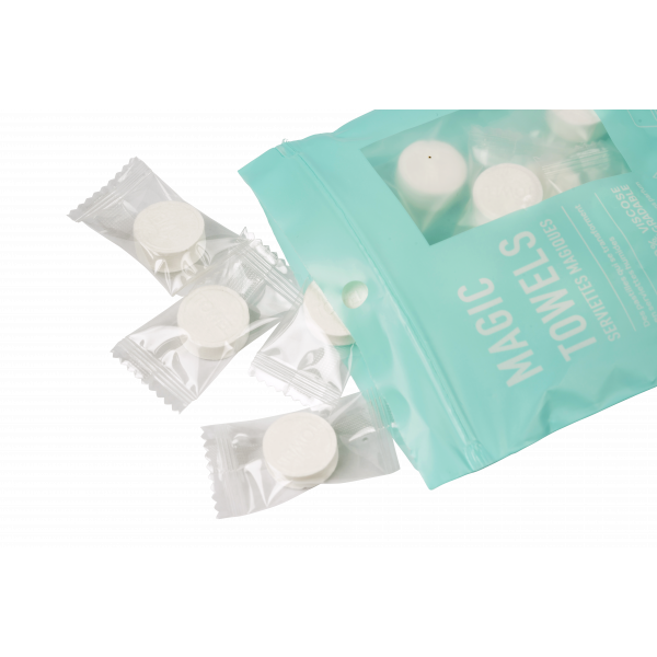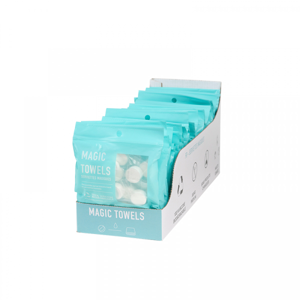 Découvrez nos nouvelles serviettes magiques ultra compactes Magic Towel ! Fabriquées à partir de matières 100% biodégradables, sans parfum ni produits chimiques. Format pratique pour se rafraîchir ou se démaquiller. Il suffit d'eau pour les activer. Chaque sachet contient 12 pastilles. Optez pour la praticité et l'écologie avec Magic Towel !