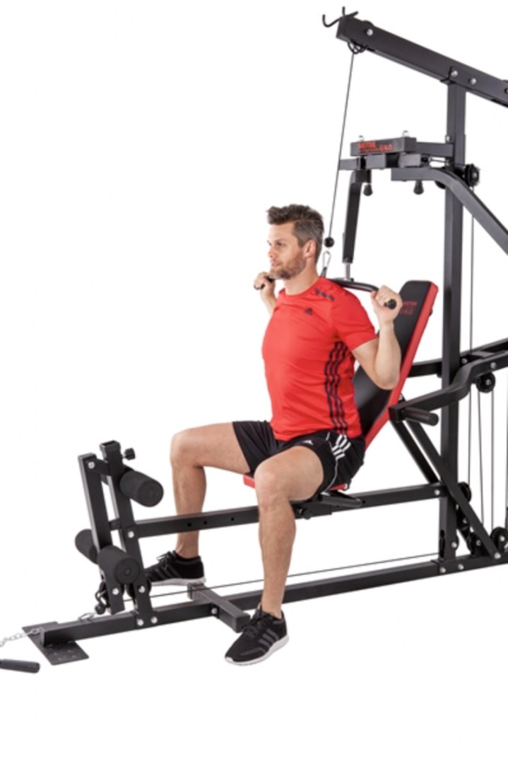La station de fitness dispose d'un câble de traction séparé. Cela peut être utilisé pour les exercices des bras et des jambes. Un bureau de curl supplémentaire peut être fixé et permet un entraînement ciblé des biceps. Le banc réglable peut être utilisé comme siège ou comme banc incliné. L'unité papillon, le pulldown lat et la presse à épaules vous permettent de renforcer tout le haut de votre corps. Des crunchs et des redressements assis peuvent également être effectués, ainsi qu'un renforcement ciblé des abdominaux et des adducteurs.