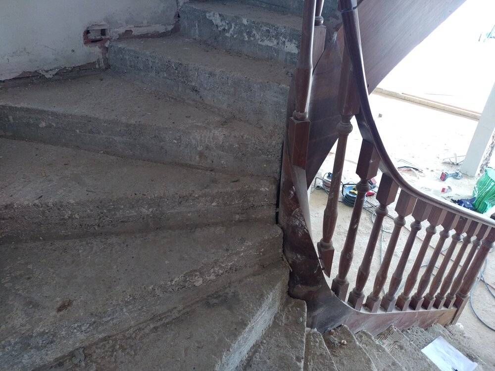 Garde-corps d'escalier en bois double quart tournant droit arrondi