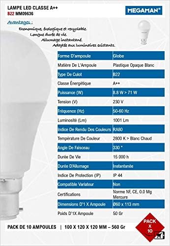 288 LOTS DE 10 AMPOULES LED MEGAMAN / B22 / 9W pour 60 W / 1001LM / 220-240V / 2800K / 15 000 Heures MM09636
