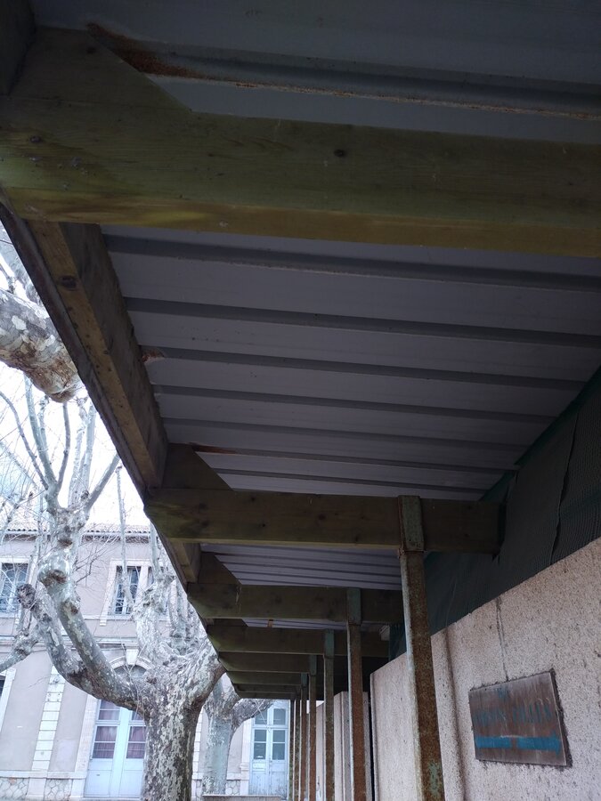 Bloc sanitaires extérieur composé d'une charpente bois et d'une couverture en tôle type bacacier