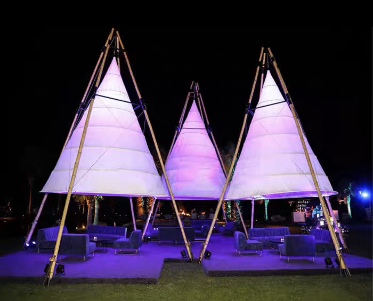 Nos tentes et chapiteau en bambou sont des produits d'exception, prestigieux et écologique. Monté sur des mâts en bambou et habillé d'un entoilage blanc.