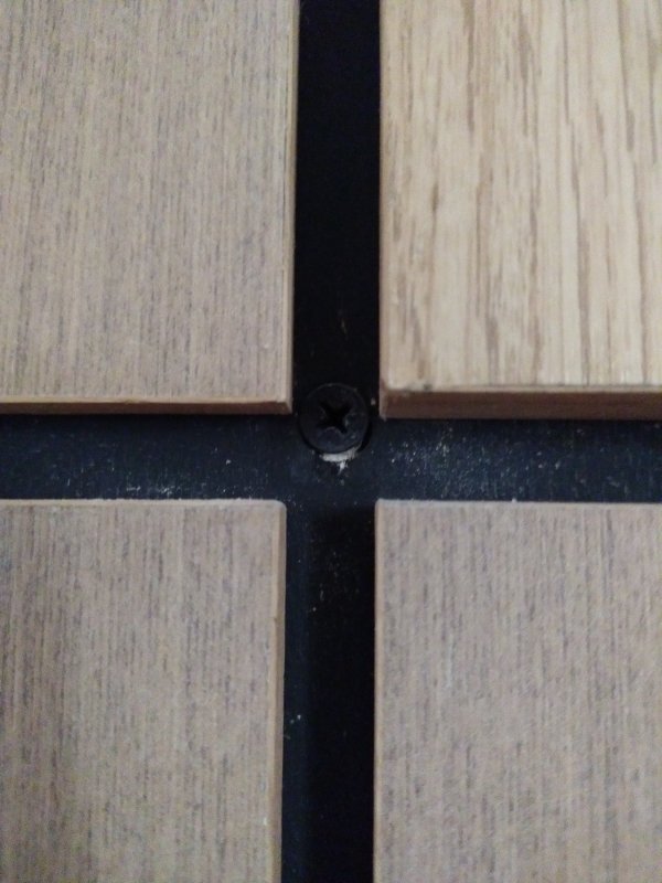 Panneau de parement mural en bois composé de 18 dalles stratifiées chêne fixées sur un plateau en bois, lui-même vissé au mur