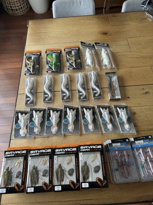 Lot stock magasin pêche cannes Dam moulinets Mitchell, Leurres Savage Gear neuf