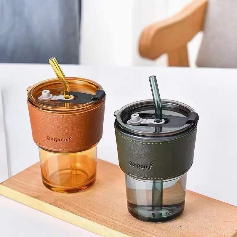 Tasse à paille en verre avec couvercle thermique et étui en cuir isolant, Portable, café, lait, thé, jus, verre réutilisable pour le bureau