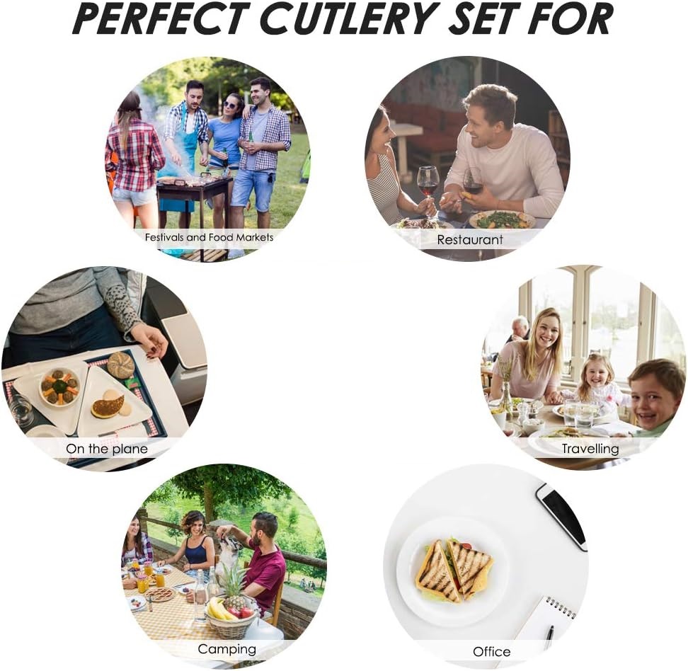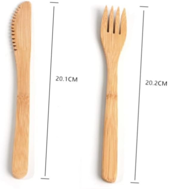 Ensemble de couverts en bambou poli. Incluant une fourchette, une cuillère, un couteau, une paille eu une goupillon de nettoyage.
