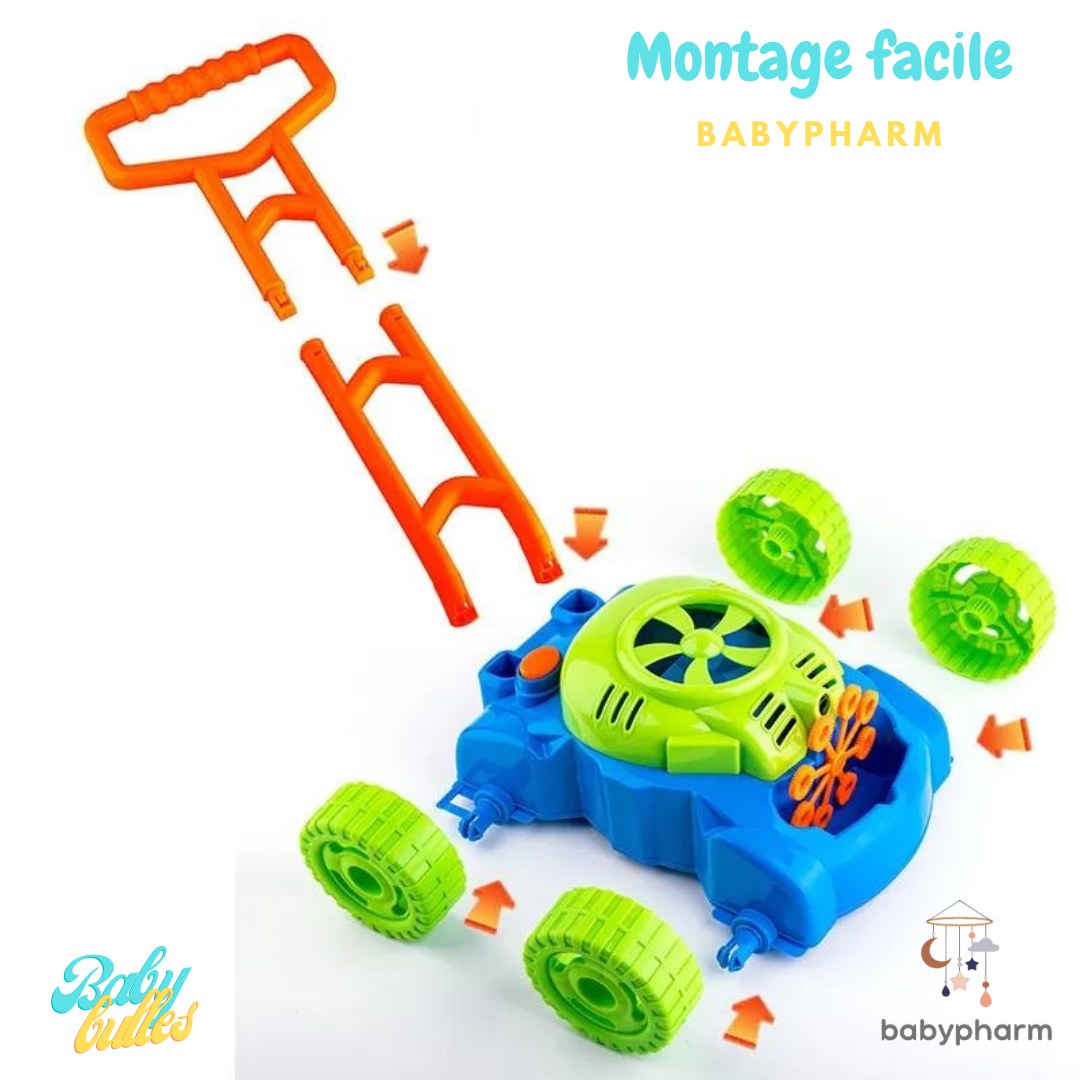Conçue pour developper la motricité fine dans l'amusement, la tondeuse à bulles BABYPHARM est facilement assemlale et démontable pour être emmenée partout.
