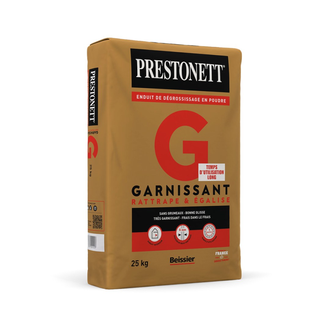 Cet enduit garnissant "G" 25 kg de PRESTONETT est idéal pour tous vos travaux d'intérieur. Il vous permettra de rattraper, dégrossir et d'égaliser tous les supports irréguliers jusqu'à 5 mm. Ce produit est notamment adapté pour les crépis, toiles de verre et gouttelette