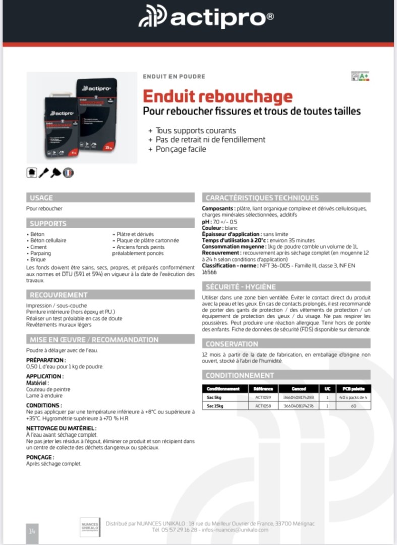 ENDUIT ACTI PRO REBOUCHAGE 15KG 12€