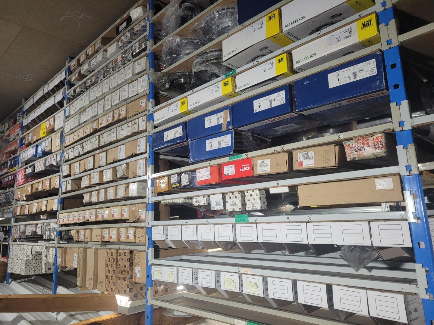 Important stock de pièces de rechange automobile neuves, emballées, référencées, disponibles immédiatement : amortisseurs, direction, allumage, filtration, embrayage, freinage, pompe à eau, carrosserie, etc.
