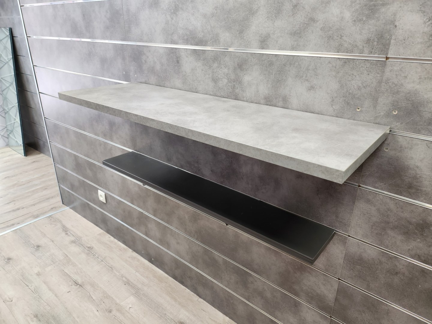 - 2 gondoles couleur béton. Prix unitaire : 468€ TTC. Dimensions : L x P x H : 127 x 67.5 x 135 cm