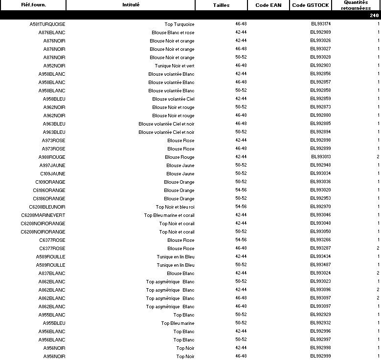 Firoza Distribution vous propose de la belle lingerie de la marque A JOUR Quantité pour 1 lot : 239 pièces (plusieurs modèles et plusieurs couleurs, tailles variées) Prix par pièce : 3€ ht seulment ! Vous pouvez prendre plusieurs lots ... Vous pouvez aussi prendre de plus petits lots... 80 pièces seulement au tarif de 3.50€ ht la pièce soit 280 euros ht le lot de 80 pièces ! Vous pouvez commander sur le site www.firozadistribution.com (livraison ultra rapide) Vous pouvez venir...