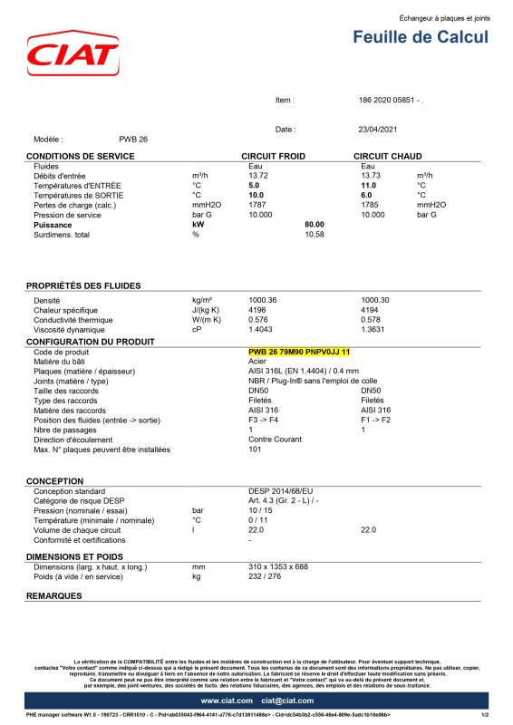 1400 € HT échangeur à plaque PWB 26 de dimensions : 310x1353x688mm / Poids : 276kg