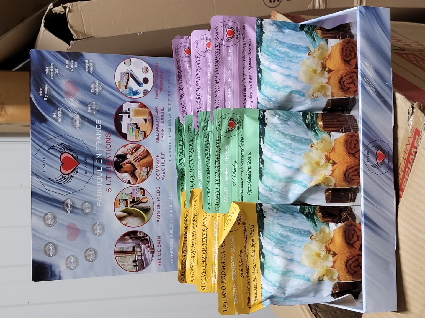 5000 sels de bains fabriqué en france avec sels de l'himalaya, huile végétales bio et 3 huiiles essentielles bio. 3 formules. avec présentoir. disponible de suite a perpignan.