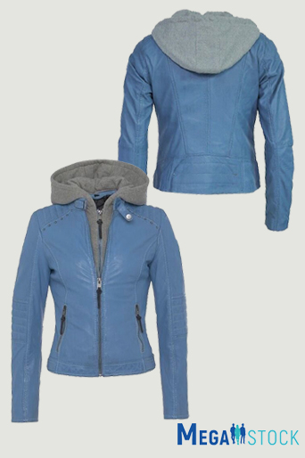 Le lot comprend un modèle de couleur bleue. Les vestes sont en cuir d'agneau de haute qualité. Modèle avec capuche et insert intérieur en coton. La capuche et l'insert intérieur en coton sont amovibles.