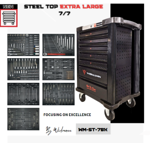 Cette version de l'armoire à outils à 6 ou 7 tiroirs de Widmann est livrée avec une large gamme d'outils de haute qualité (clés à douille, clés de serrage, tournevis, pinces et bien plus encore). Que ce soit pour votre salle de loisirs, votre atelier ou votre garage, cette armoire à outils est une solution parfaite. Grâce à la serrure intégrée, 6 / 7 tiroirs peuvent être verrouillés en même temps, ce qui évite que les tiroirs ne s'ouvrent accidentellement lors du déplacement de l'armoire. Le plan de travail robuste du chariot à outils permet de garder à portée de main les outils fréquemment utilisés. Les parois à double paroi, le renforcement du corps et les glissières de tiroir à roulement à billes garantissent un fonctionnement en douceur. Points forts :