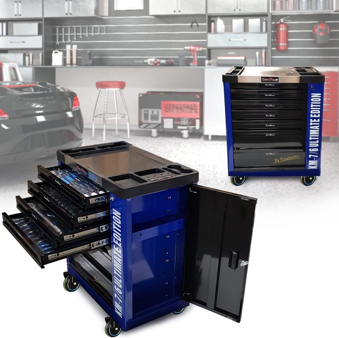 - ✅ Servante PRO Kraft Muller XXL EDITION KM 7/6 TOOL Finition BLEUE/NOIR. La construction en tôle prépeinte soudée et le plateau en acier du chariot le rendent solide et durable. Les outils en chrome vanadium sont rangés dans des tiroirs confortables avec thermoformage en mousse souple. Une porte latérale pratique vous permet de ranger les sprays et autres équipements.