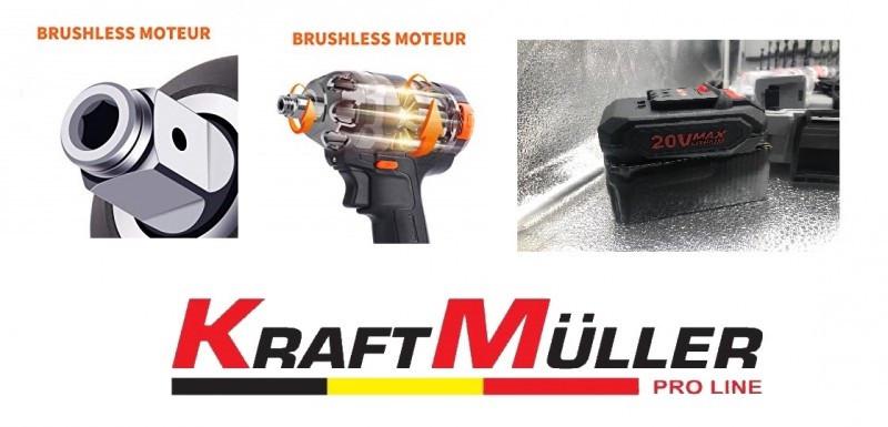 KRAFT MULLER vous propose un CLE A CHOCS SANS FIL 20V avec un MOTEUR BRUSHLESS