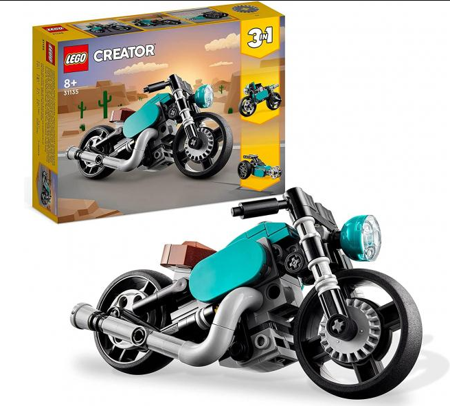 Les enfants et les passionnés de véhicules dès 8 ans vont jouer à la course pendant des heures avec l'incroyable moto ancienne LEGO® Creator 3-en-1 (31135). La moto classique possède un guidon, une roue avant mobile, des phares, un grand pot d'échappement et une béquille pour l'exposer.