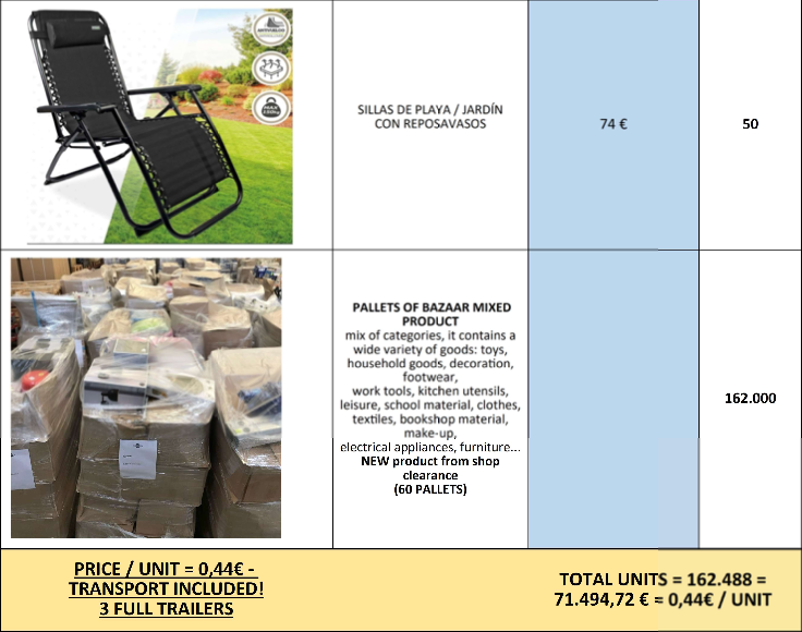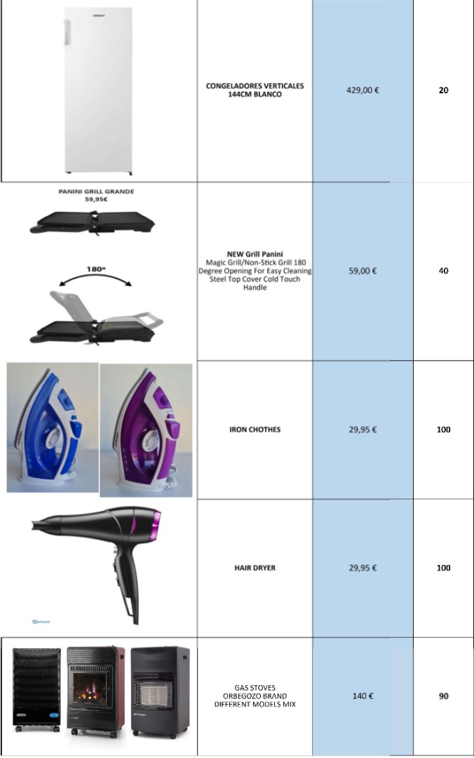 Réfrigérateurs combis, lave-linge, lave-vaisselle, congélateurs plaques de cuisson 180º, petit électroménager, poêles à gaz, chaises de jardin/plage et palettes de produits mixtes de liquidations (textile, ustensiles, décoration, outils, jouets, etc... )