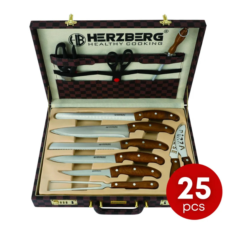 Consider the Herzberg HG-K25LB as a perfect gift for a discerning connoisseur. This 24-piece set includes various knives, a meat fork, steak cutlery, and a sharpening steel, all with ergonomic wooden handles for a comfortable grip during meal preparation.