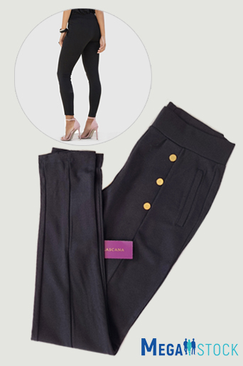Pantalon moulant de coupe normale à la taille, fuselé en bas. Le modèle est orné de boutons dorés. Il y a des poches latérales fendues. Les pantalons soulignent favorablement la dignité de la silhouette féminine.