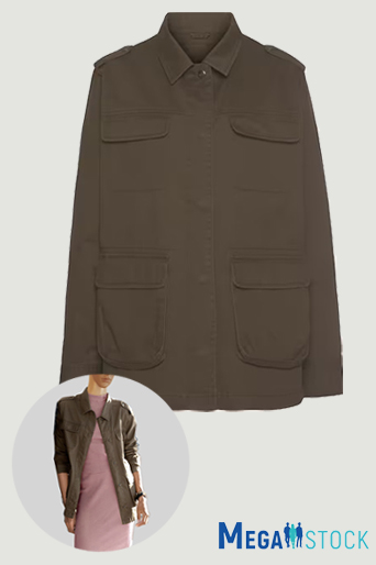 La veste-chemise est confectionnée dans un style militaire. Le modèle a la coupe d'une chemise pour homme, réalisée avec des bretelles et des poches plaquées.
