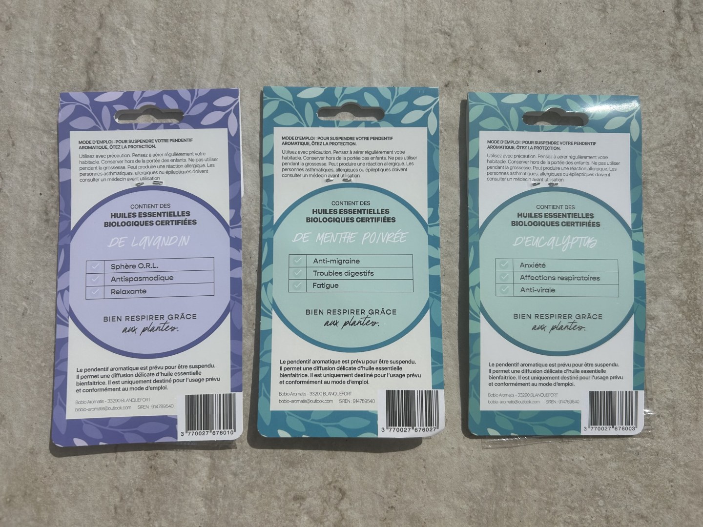Découvrez nos lots de pendentifs odorants infusées aux huiles essentielles 100% Biologiques de la marque Bobio Aromatis.