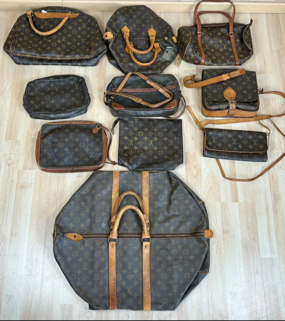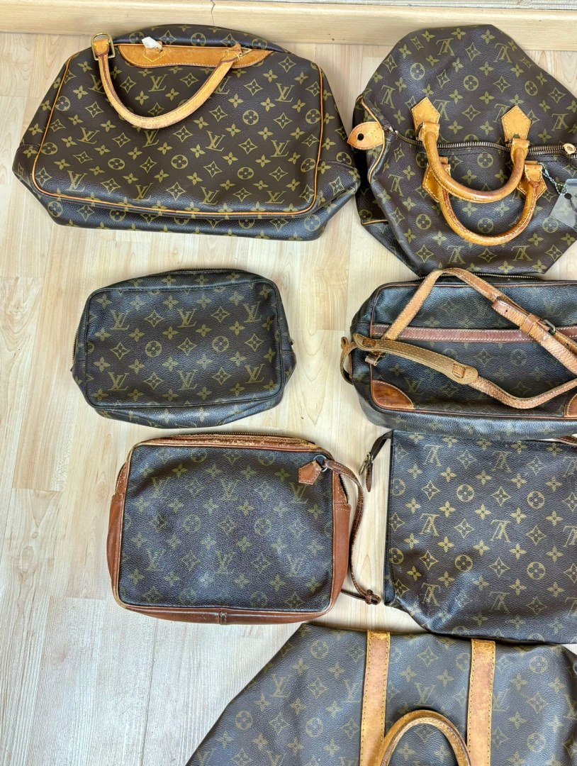 I am selling a lot of 10 vintage Louis Vuitton bags and accessories, including a handbag, a travel bag, and a toiletry pouch.