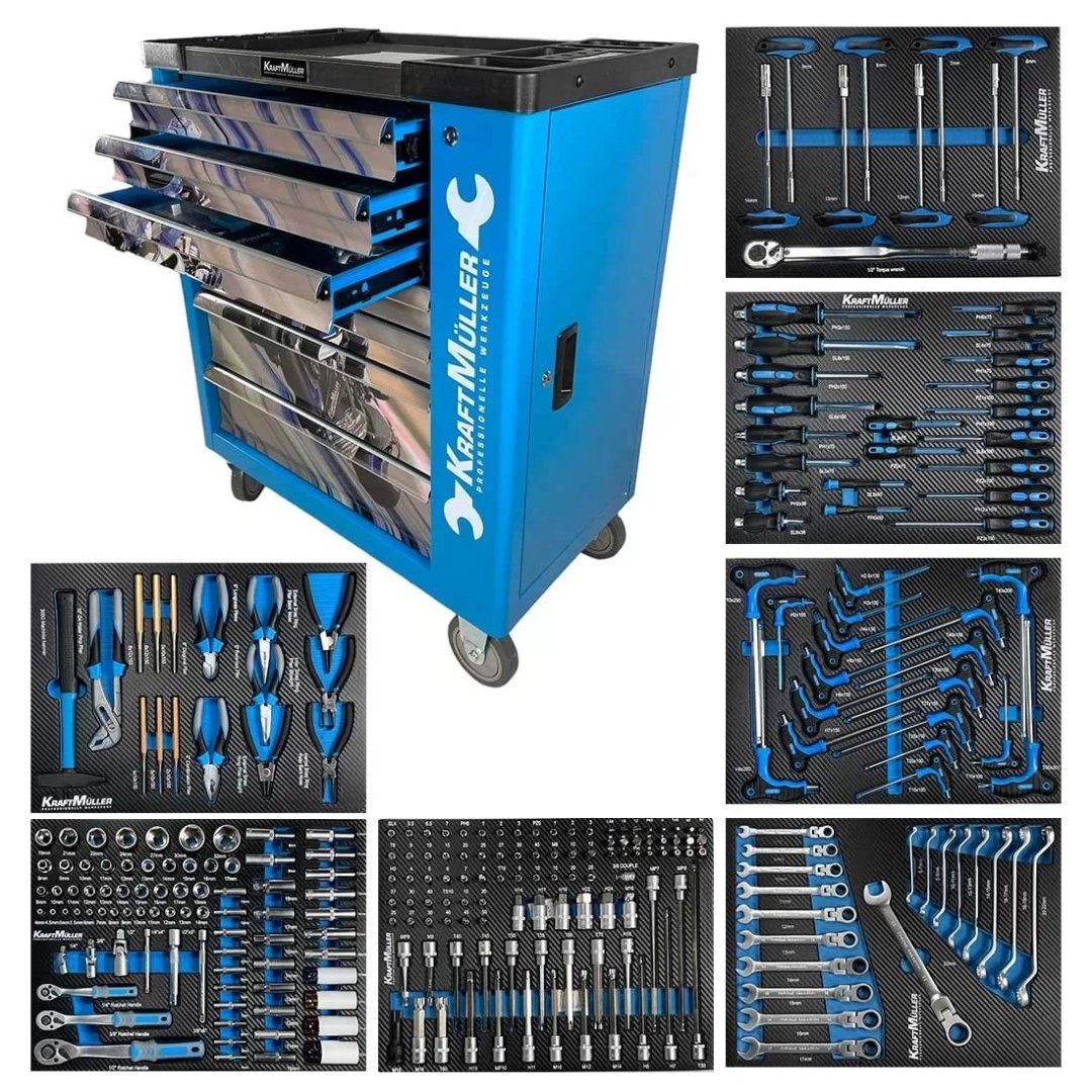 Cette servante d'atelier se compose de 7 tiroirs pleins d'outils de qualité professionnelle : 581 pièces de la marque de renommée allemande Kraft Müller, rangées par types et par tailles dans des compartiments en mousse Eva