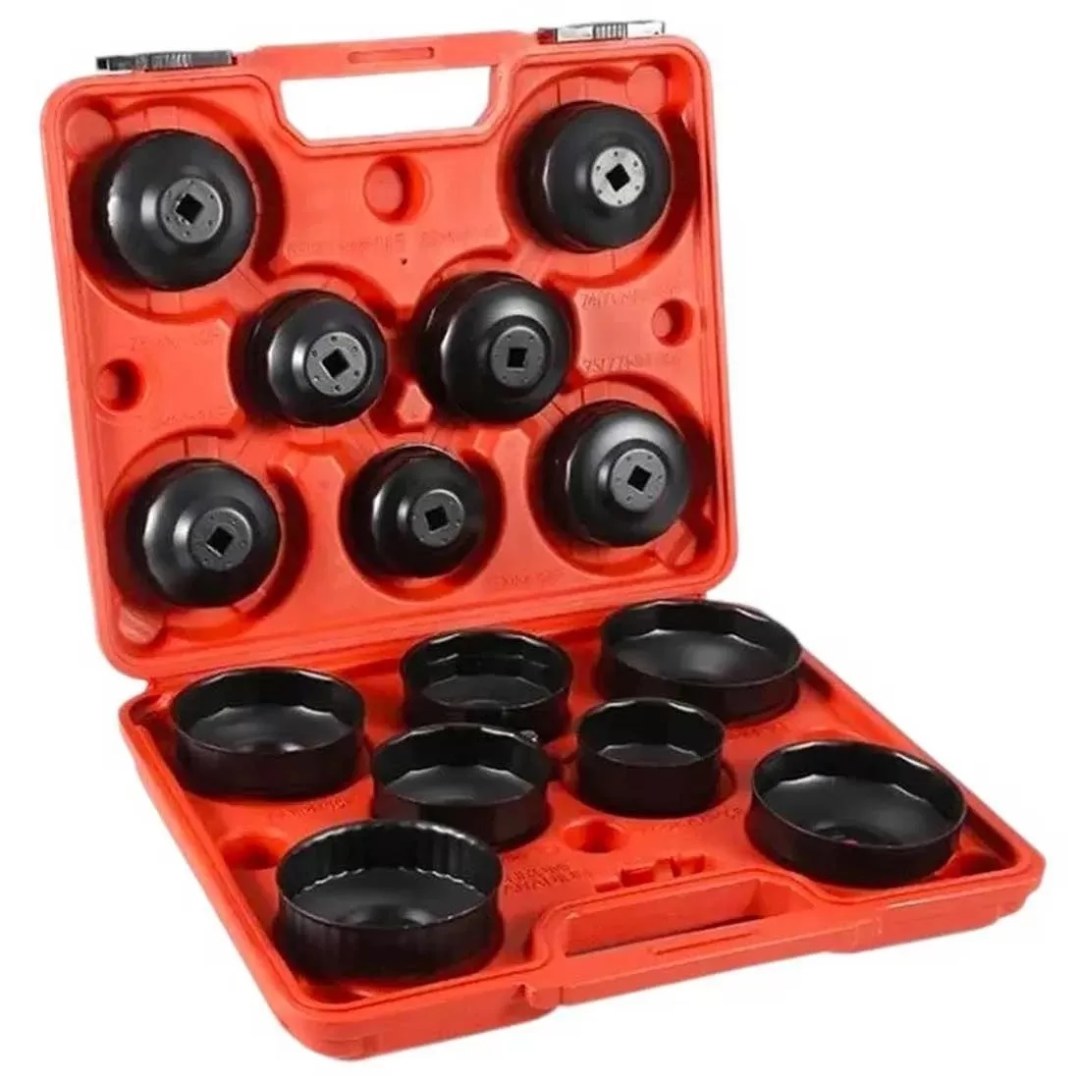 Kraftmuller vous presente le lot de 15 pièces pour le montage et le démontage du filtre à huile commune et couvercle du boîtier de filtre. Convient pour une utilisation dans la zone de l'automobile et de l'atelier. Adaptateur déjà inclus peut être utilisé avec cliquets 3/8 "et 1/2". A double porte-outil renforcé parfaitement raccord gaufrage intérieure en coffret plastique.