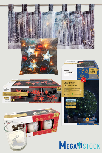 Le lot comprend une large gamme d'accessoires du Nouvel An pour la maison et le quartier : bougies et chandeliers, guirlandes, couronnes de Noël, nappes, taies d'oreiller LED, rideaux de différentes tailles avec et sans éclairage LED, décorations en feutre et autres éléments décoratifs. Articles issus des collections de marques européennes populaires.
