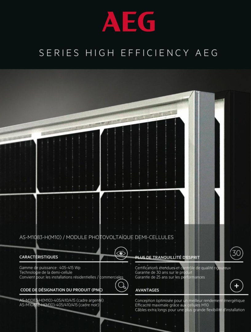 Spécialisés dans le secteur des panneaux photovoltaïques depuis 2011, nous vous proposons des solutions fiables à des prix compétitifs. Nous procédons actuellement à un déstockage de 1 000 panneaux photovoltaïques neufs de la marque allemande AEG, reconnus pour leur qualité, leur durabilité et leur puissance.