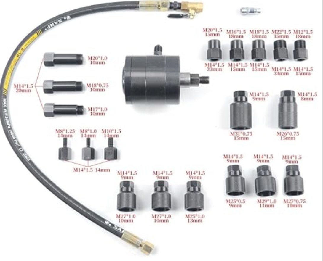 Extracteur d'injecteur pneumatique. Comprend un extracteur et divers adaptateurs, compatibles avec une large gamme d'injecteurs sur le marché.