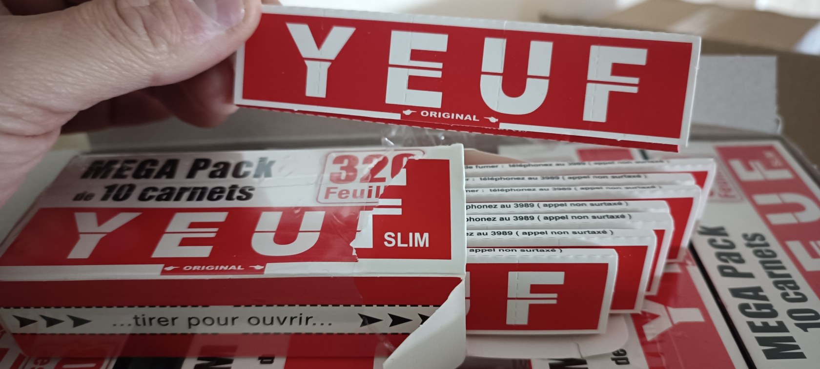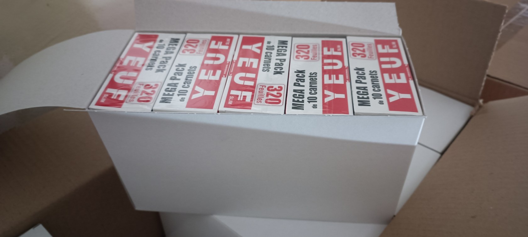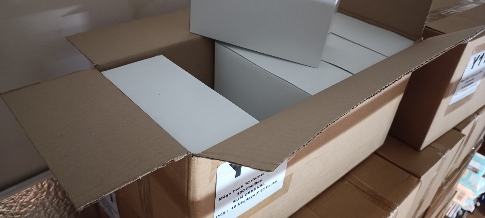 display de 25 packs (soit 250 paquets de feuilles) => 0.30€ht le carnet
