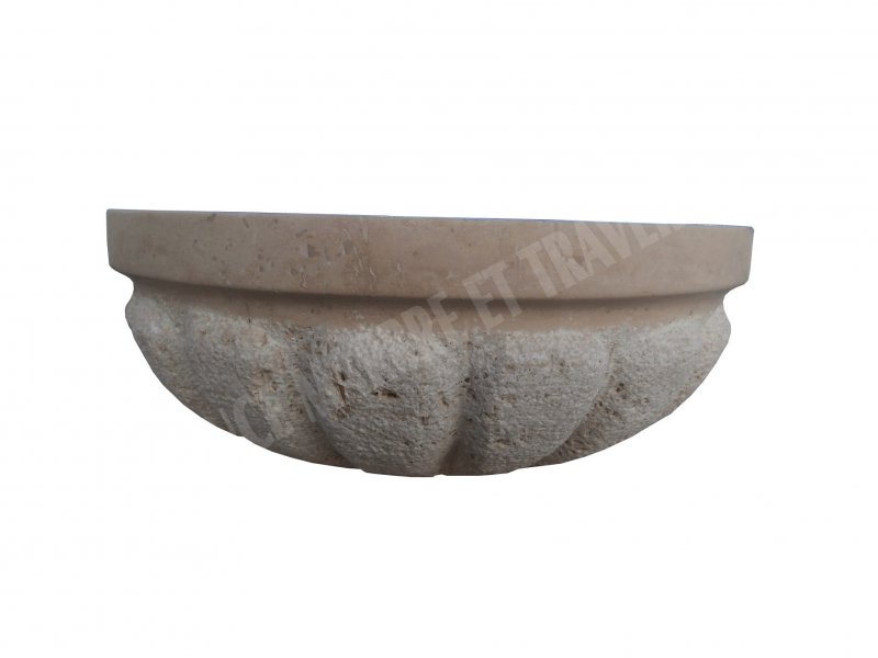 Travertin Classique Beige Vasque Melon Bouchardé Hauteur : 15 cm Qualité : 1'er Choix Diamètre : 42 cm Finition : Adouci & Mat PRIX : 250 € HT – Pièce |