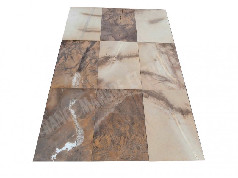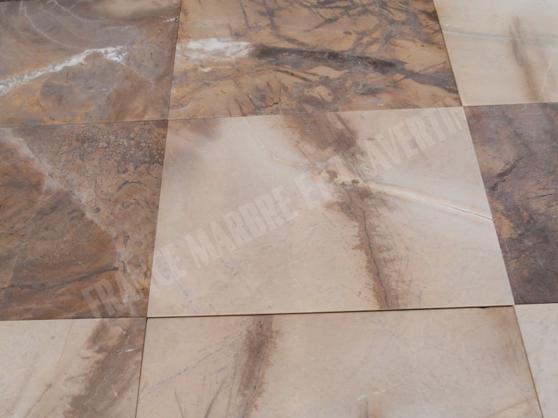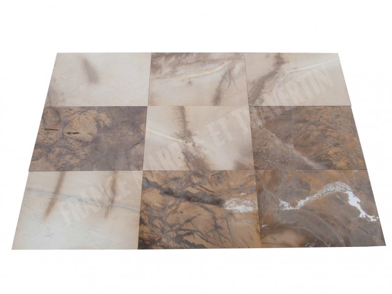 Marbre Jaune Picasso 40x60 cm Épaisseur : 1,2 cm Finition : Brossé & Patiné Qualité : 1'er Choix PRIX : 39 € HT – m² |