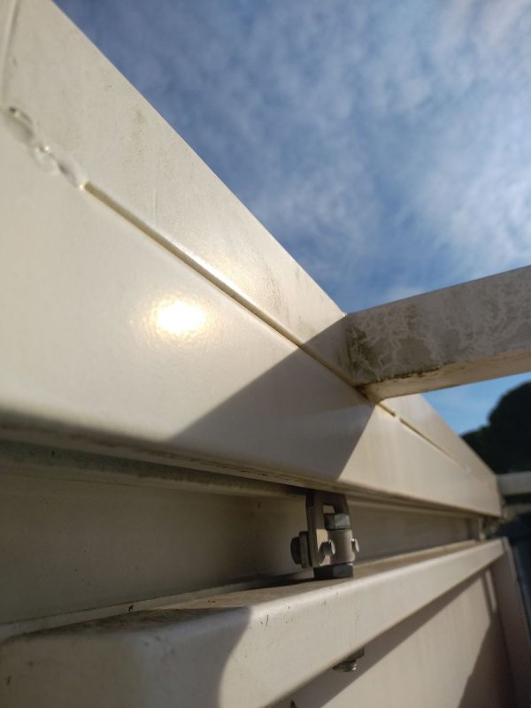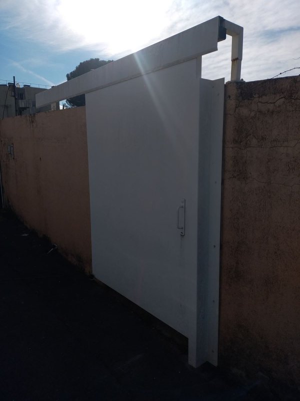 Portail coulissant 150 x H196 x 5 cm fixés sur 3 poteaux coudés boulonnés sur platine de hauter 33 cm