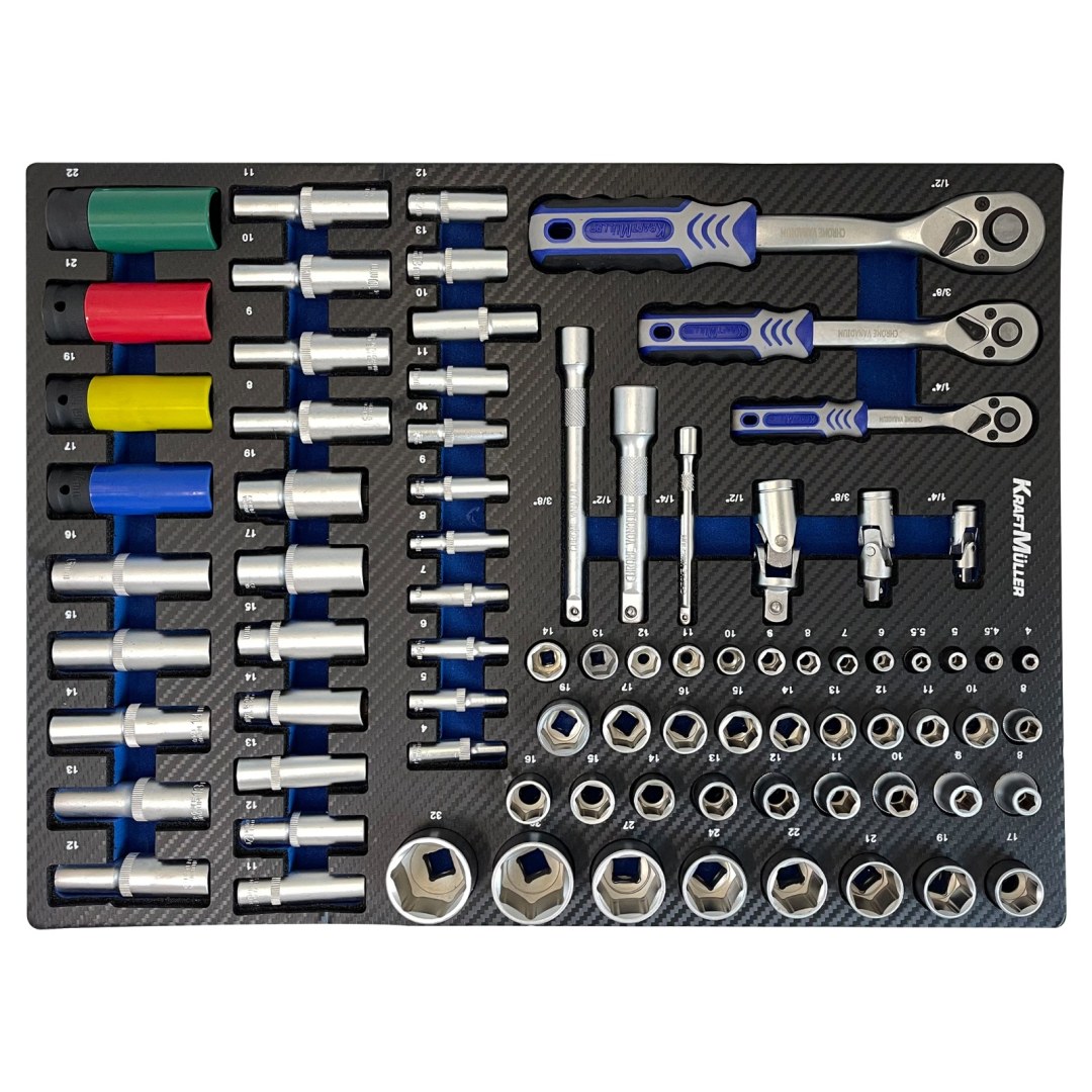Tiroir 1 : lot de 3 cliquets ¼ 3/8 ½ avec douilles courtes et douilles longues, rallonges et cardans + 4 douilles choc bague téflon